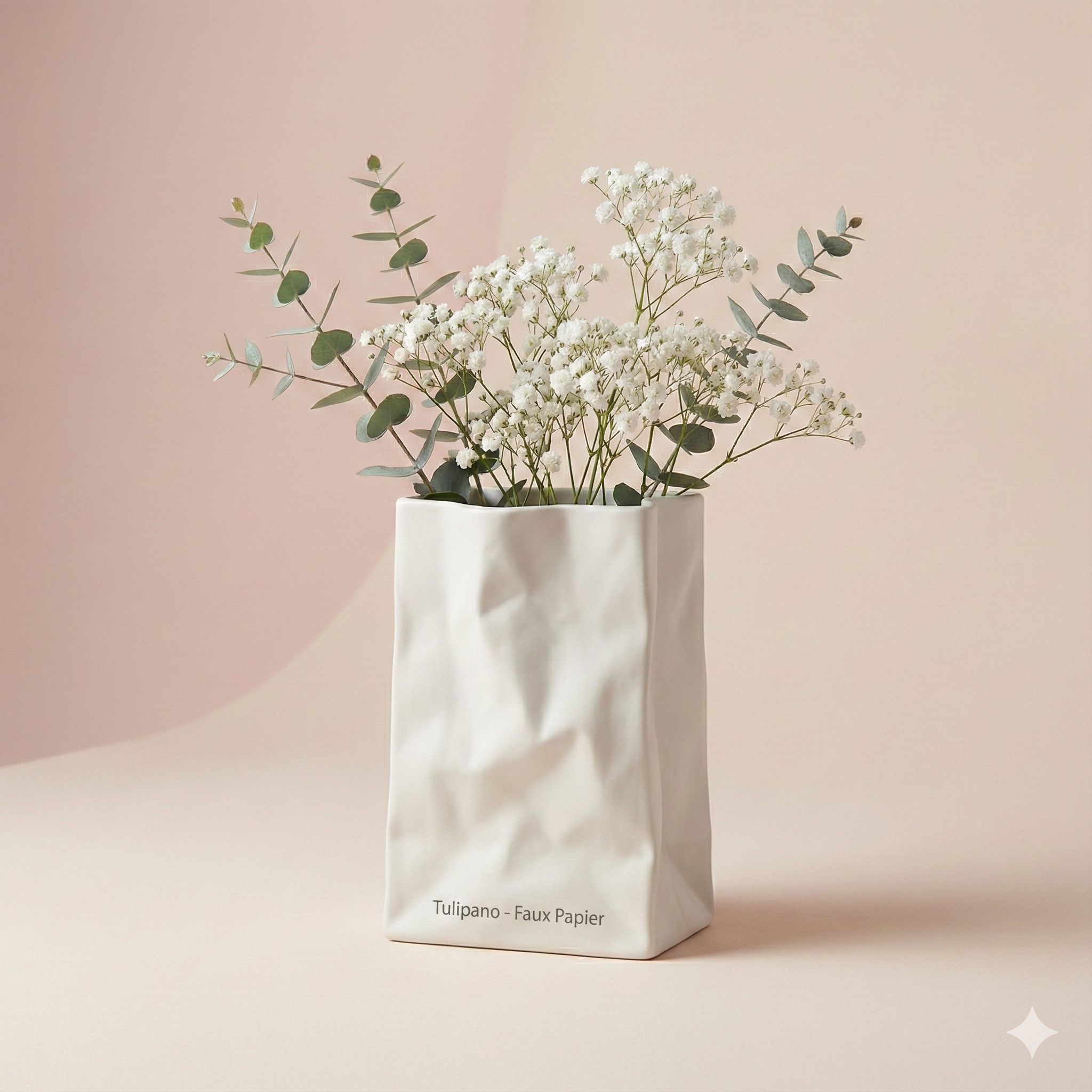 Faux Papier blends artistic texture with modern minimalism.Its sculptural paper-bag–inspired silhouette, crafted in crisp white ceramic, adds a playful yet... Read more